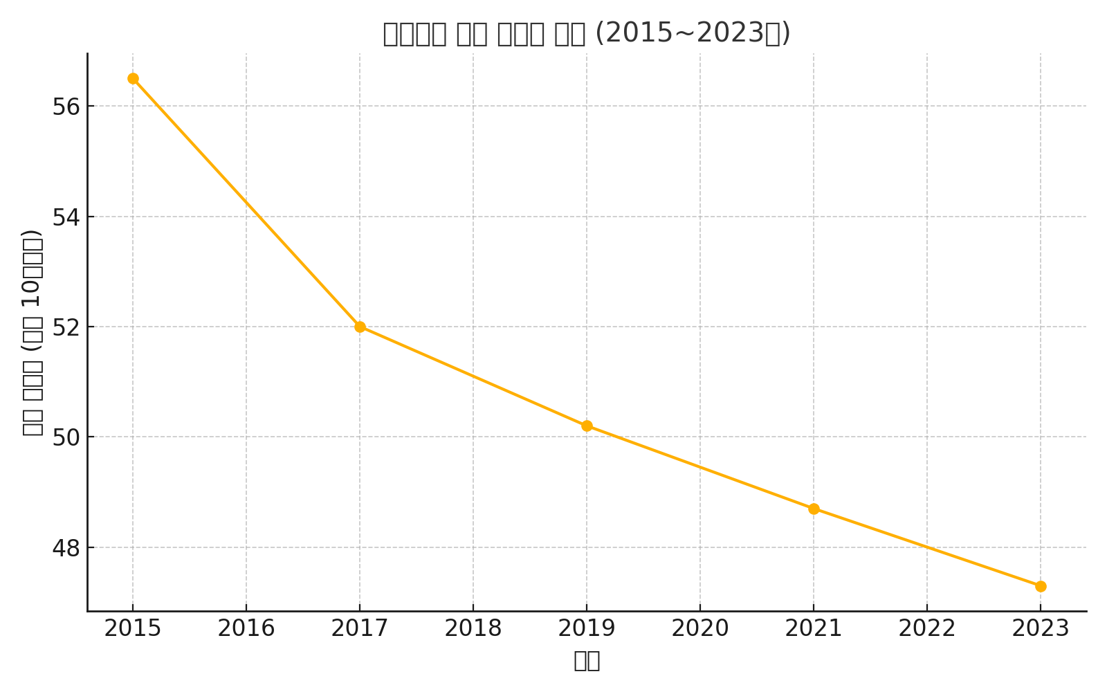 국내 위암 발생률은 최근 몇 년간 다소 감소하고 있지만 여전히 높은 수준을 유지하고 있습니다. 아래 그래프는 2015년부터 2023년까지의 우리나라 위암 발생률 추이를 보여줍니다.